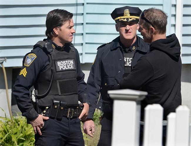 "Patriots Day" star Mark Wahlberg, left, confers with Peter Berg, right, the film's director, and actor James Colby, before filming scene where police search a house on Dyer Street in Framingham Wednesday. Daily News and Wicked Local Staff Photo/Ken McGagh